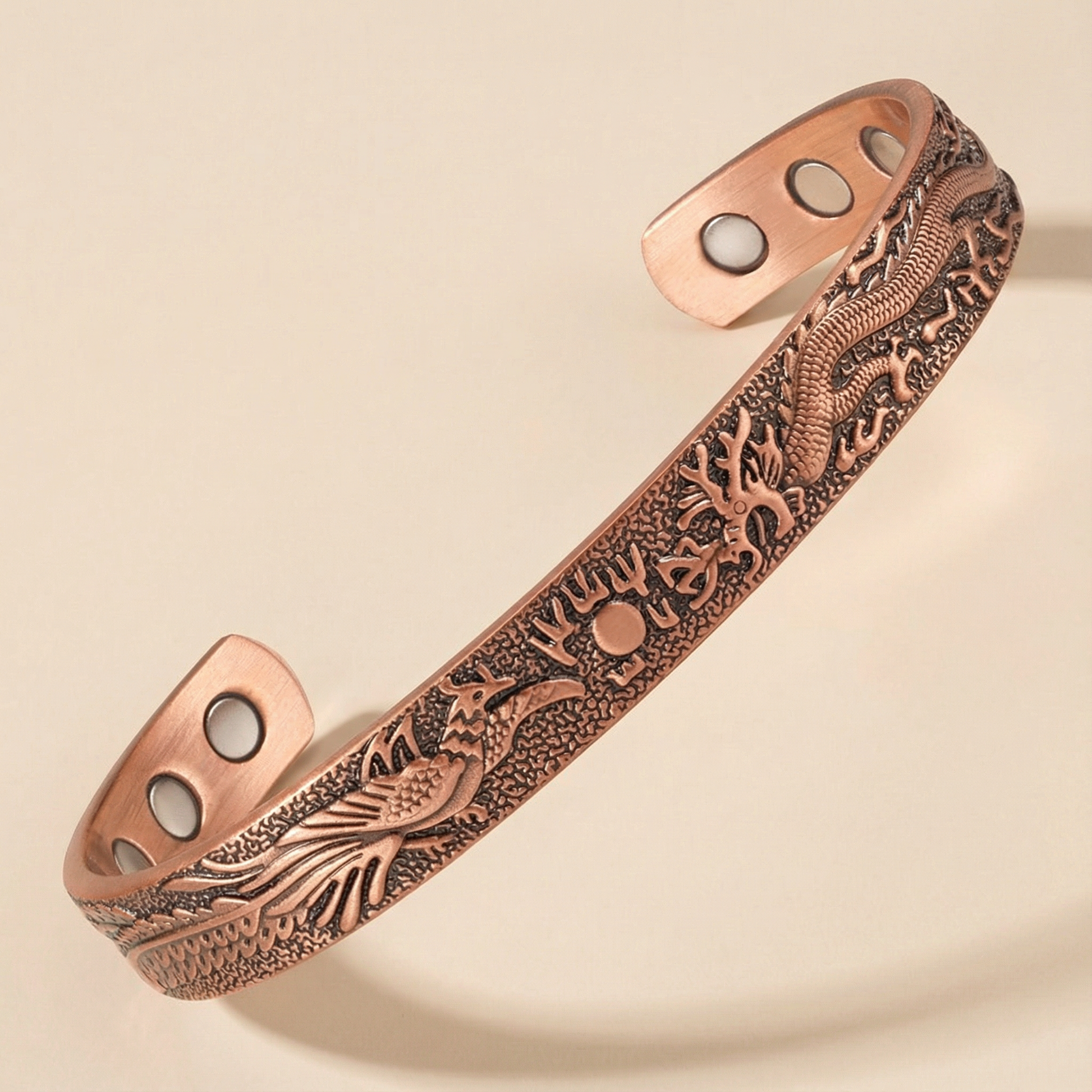 צמיד נחושת מגנטי מעוצב פיניקס ודרקון | הקלה על עומס וכאב ותחושת איזון בגוף | מתאים לגברים ולנשים | נרתיק בד מתנה